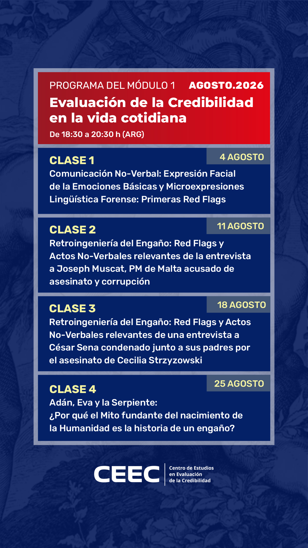 En el MÓDULO 1 estudiaremos tres casos reales que cuentan con registros audiovisuales provenientes de fuentes abiertas. Trabajaremos sobre la identificación de INDICIOS DE FALSEDAD (RED FLAGS) tanto verbales como no-verbales presentes en entrevistas y testimonios, articulando cada observación con la teoría que sustenta su relevancia probatoria. El objetivo no es la intuición ni la lectura superficial de los gestos, sino el análisis estructurado de marcadores lingüísticos y narrativos, patrones de carga cognitiva y conductas regulatorias (Adaptadores).